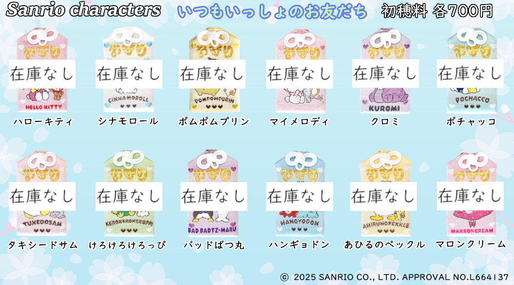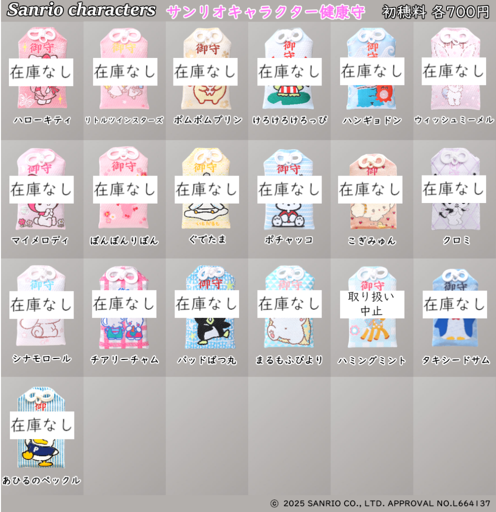 正月期間における一部のサンリオキャラクター健康守の在庫状況は下記をご覧ください